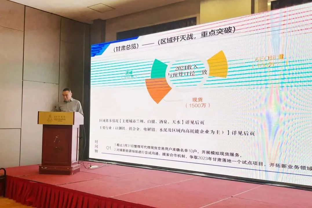 甘肃分公司总经理刘宝庆详细汇报了2023年甘肃公司的工作总结,并对2024年的人员规划及业务部署进行了全面阐述。2024年将重点开展甘肃现货交易新业务,开拓公司在新能源场站储能电站托管运营新领域,在业务部署层面,将聚焦于市场拓展计划、产品策略和客户服务提升等方面。